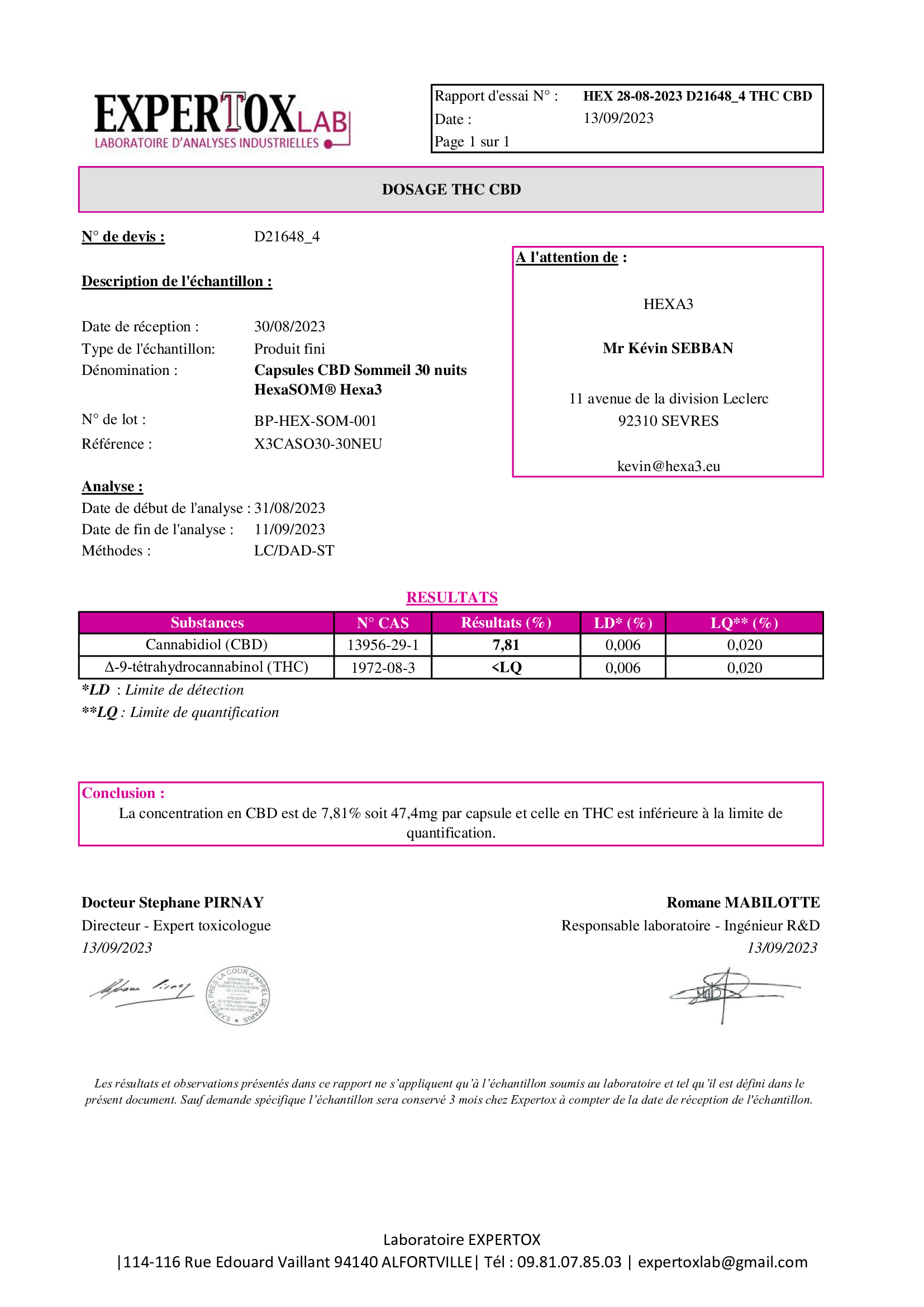 Produit fabriqué en France puis certifié en laboratoire agréé GMP. Enfin, retrouvez le certificat d'analyse du produit parmi les photos sur cette page.